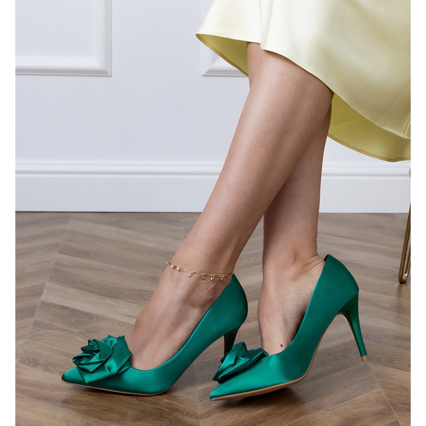 Discover an unparalleled style and elegance thanks to green satin pumps with a flower, FB-302 model. Ideal for women looking for combinations of modern design with comfort, these classic women's shoes attract attention not only with their unique shade of green, but also with a careful finish.