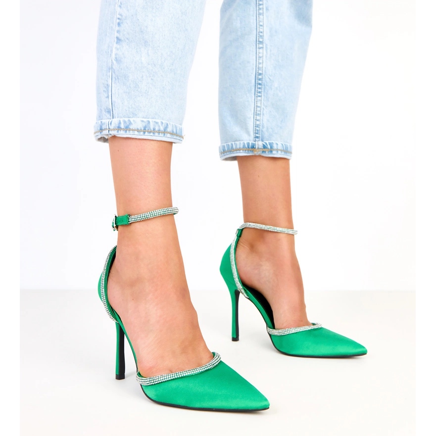 Details: Green satin pumps with zircons fastened with ankle Zizia
