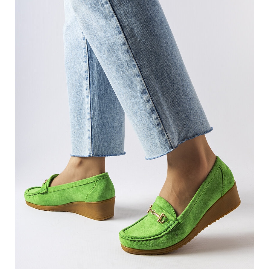 The Canis green suede wedge loafers are the epitome of elegance and comfort. These stylish shoes feature an almond toe that gives them a subtle character, perfectly in line with fashion trends. Thanks to the slip-on construction, wearing them is extremely comfortable, making them a great choice for everyday wear.