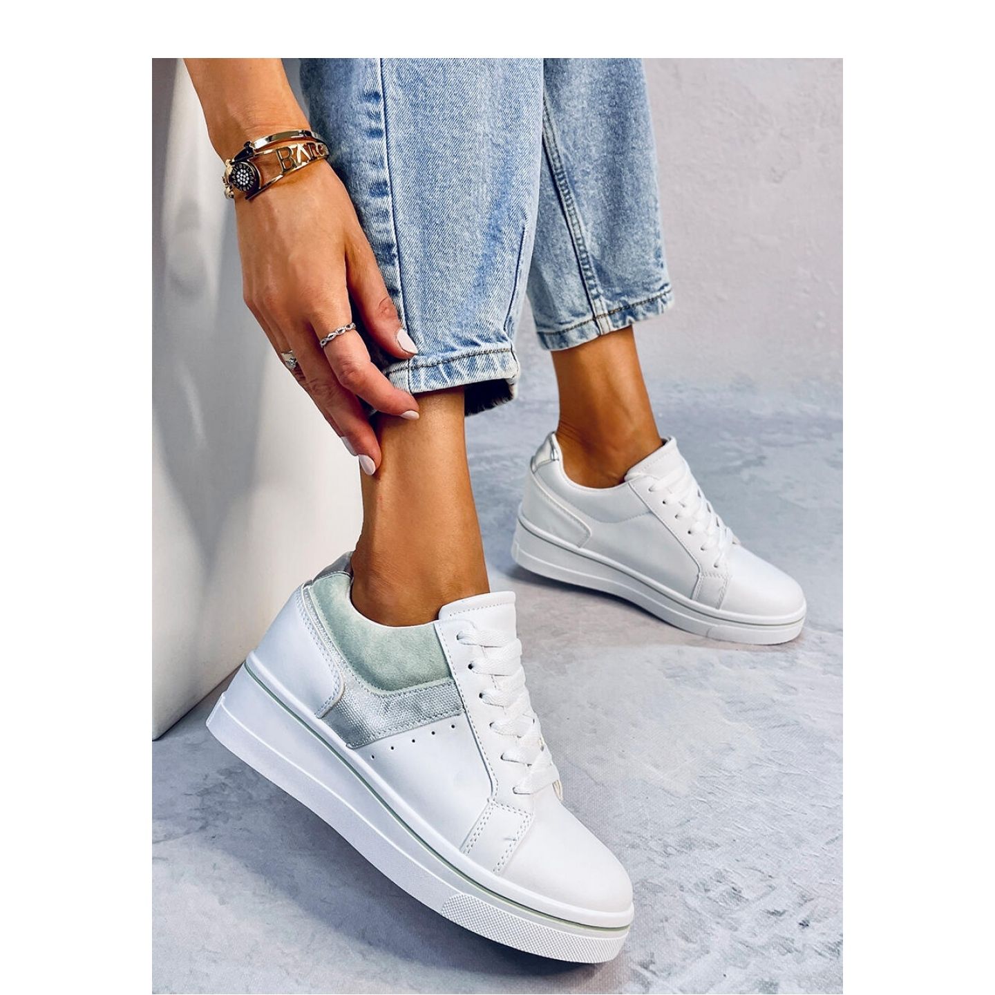 Sneakers on a white wedge in white is a perfect combination of style and comfort, which will certainly catch the eye. These two -colored sports shoes, with characteristic green accents, suede and metallic inserts, stand out from other models. With a height of the wedge of 7 cm, they add a spectacular look, without giving up the comfort of wearing.