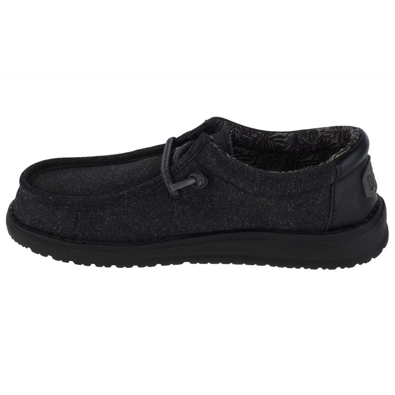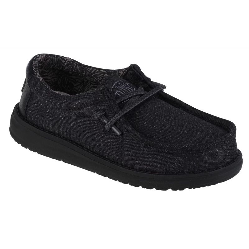 Classic and universal Hey Dude Wally Youth Basic shoes for children. A low, lace -up model perfect every day - it works both for school wardrobe and in the open air play. The upper made of textile/synthetic materials and a textile lining ensure comfort of wearing, and the timeless black colors match every stylization.