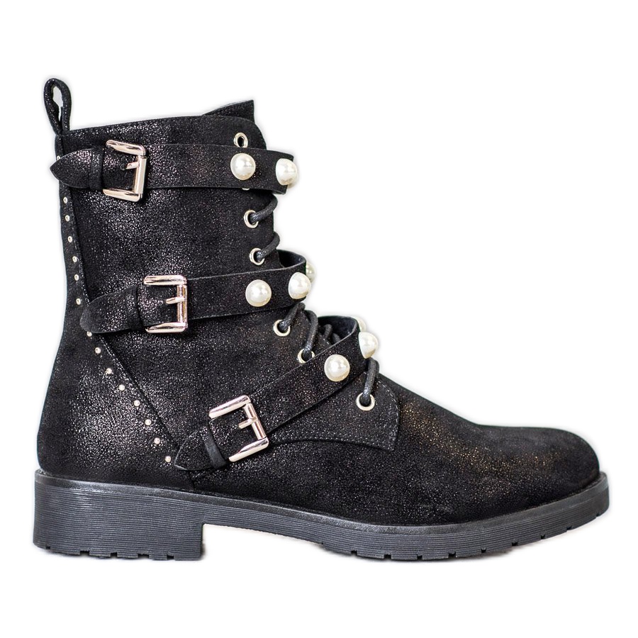 These stylish ankle boots feature laces at the front and a practical zipper on the side, making them easy to put on and take off. Additionally, their original look is emphasized by straps with buckles decorated with pearls and small shiny rhinestones, which add a rock character to them.