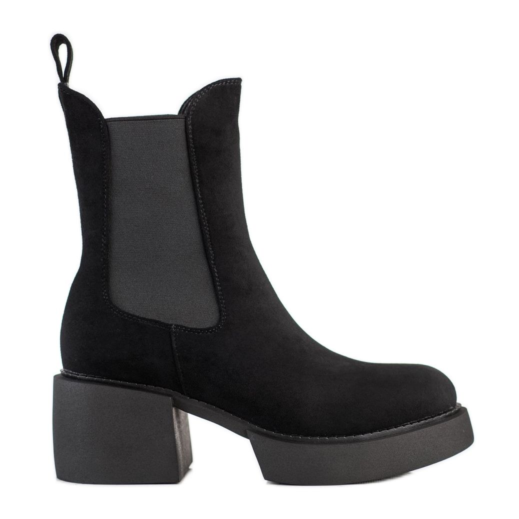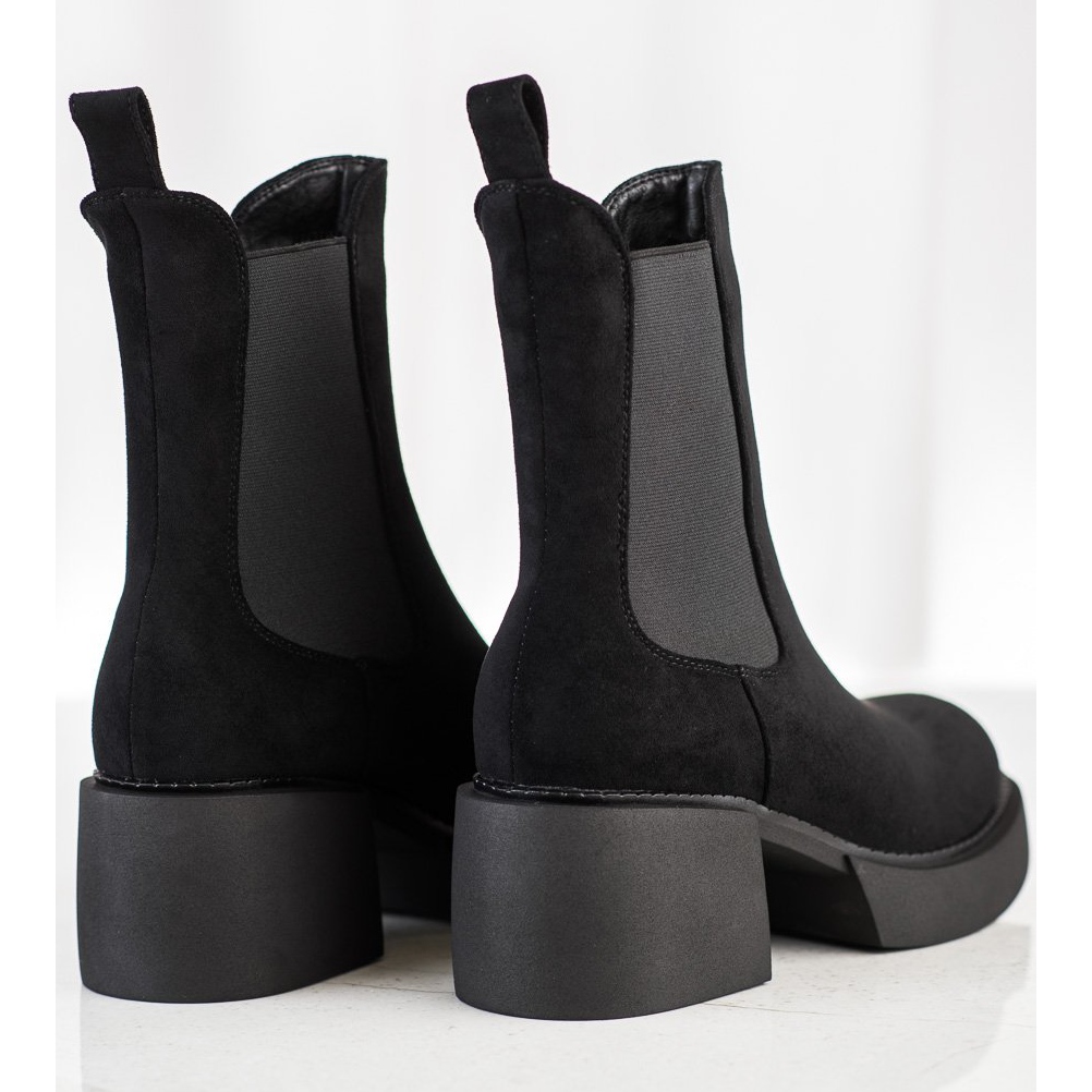 The high upper, which reaches above the ankle, is made of ecological leather imitating suede, which gives the shoes a chic look. The soft, closed heel and textile interior ensure comfort and fit to the foot. Additionally, the 6.5 cm high column-shaped heel and 2 cm high platform provide stability and lightness of step.