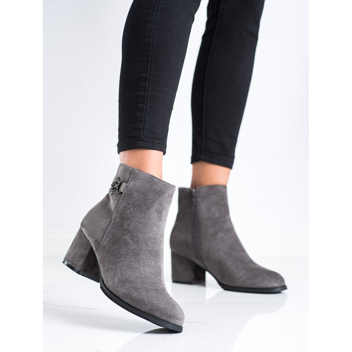 The boots are distinguished by a built-in, stiffened heel counter, which provides additional support and comfort of wearing. Made of high-quality ecological suede leather, they look exceptionally elegant. Additionally, silver decorations in the form of rhinestones add a subtle shine, making every styling take on a unique expression.
