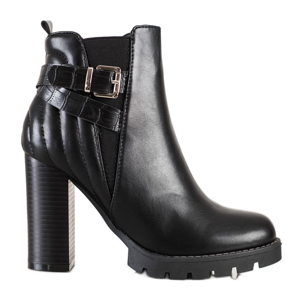 These shoes are characterized by a built-in, stiffened heel and a high heel in the form of a 10.5 cm column, which adds class and chic. Made of ecological imitation leather, they are not only fashionable, but also environmentally friendly. The interior of the boots is made of textile material, which provides comfort and warmth on colder days.