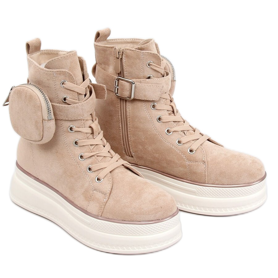 We present the beige HO263 Beige ankle-high sneakers, which combine fashionable design and practicality. These suede women's sneakers are distinguished by a high sole, which gives them a unique character. An additional advantage is the unique pouch, which can be freely removed, providing not only style but also functionality.