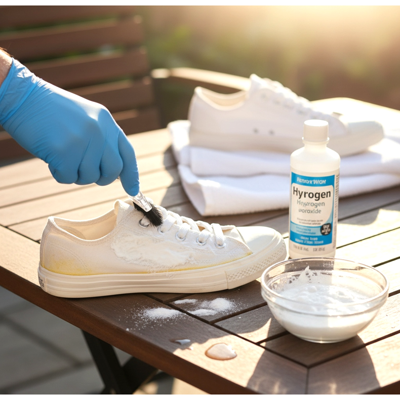 One of the best remedies for yellowing is a mixture of hydrogen peroxide and baking soda. This combination has whitening properties that remove discolorations without damaging the material. Apply the mixture to the dirty area, leave it in the sun for 20-30 minutes (UV radiation activates the whitening properties), and then rinse thoroughly with water. This method works best on synthetic and canvas materials.