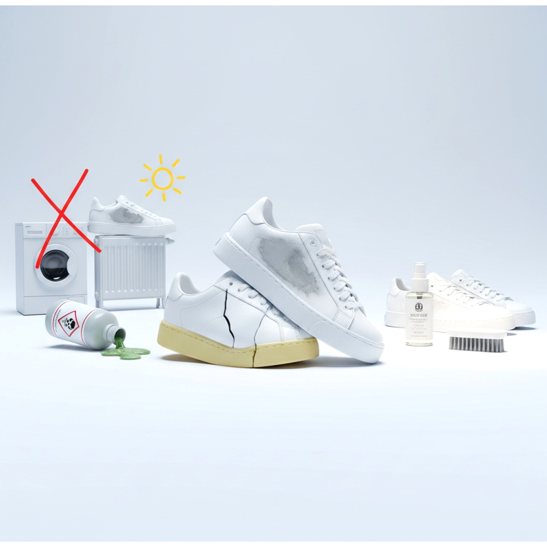 Before wearing your new white sneakers for the first time, spray them thoroughly with dry impregnation. This creates an invisible protective barrier. Repeat the impregnation every 2-4 weeks, especially after each shoe cleaning. When impregnating white sneakers, choose colorless agents that will not change the shade of the shoe.