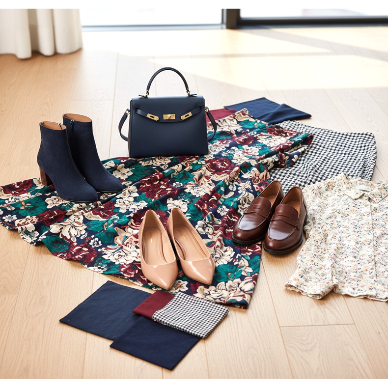 The 60-30-10 rule will help you balance the colors in your styling. 60% of the outfit should be the dominant color (e.g. dress), 30% the secondary color (e.g. handbag, coat), and 10% the accent color (e.g. shoes, jewelry). Shoes as an accent can be expressive without overwhelming the whole.