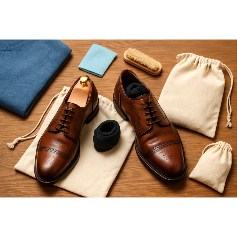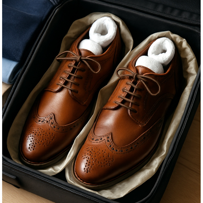 For travel: pack strategically, fill the interior, protect the soles. For storage: shoe trees, bags, dry place, regular checking.