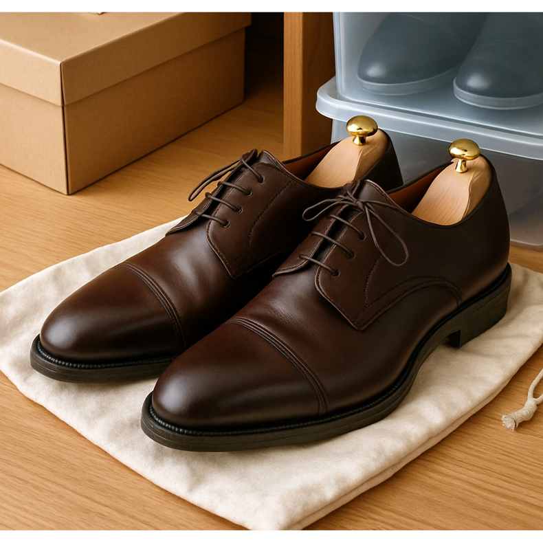 Wooden trees ALWAYS. Fabric bags (skin must breathe). Maintenance before storage (cream, impregnation). Check every 2-3 months.