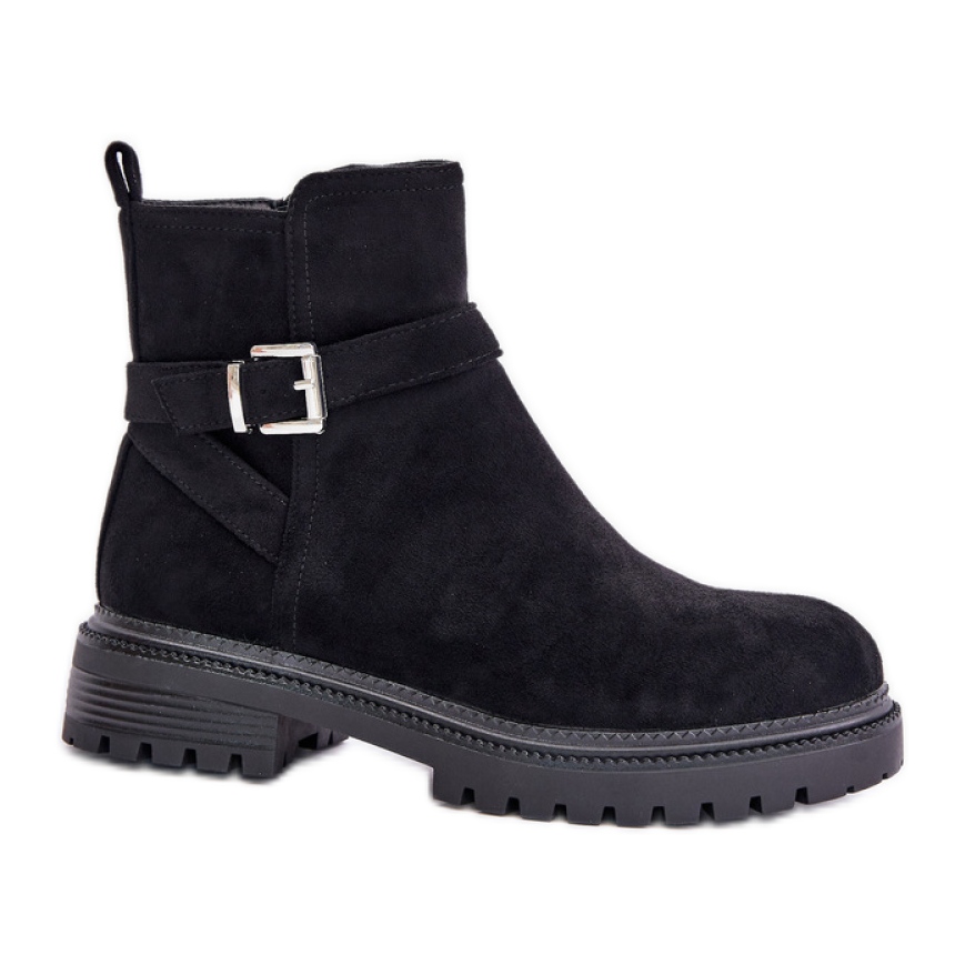 Insulated women's boots with black black clamp is a great choice for cool autumn and winter days. Made of high quality eco suede, these low boots combine elegance and comfort of wearing. Set on a stable, flat heel with a height of 4 cm, they provide comfort during daily activities, and at the same time add a stylish accent of any stylization.