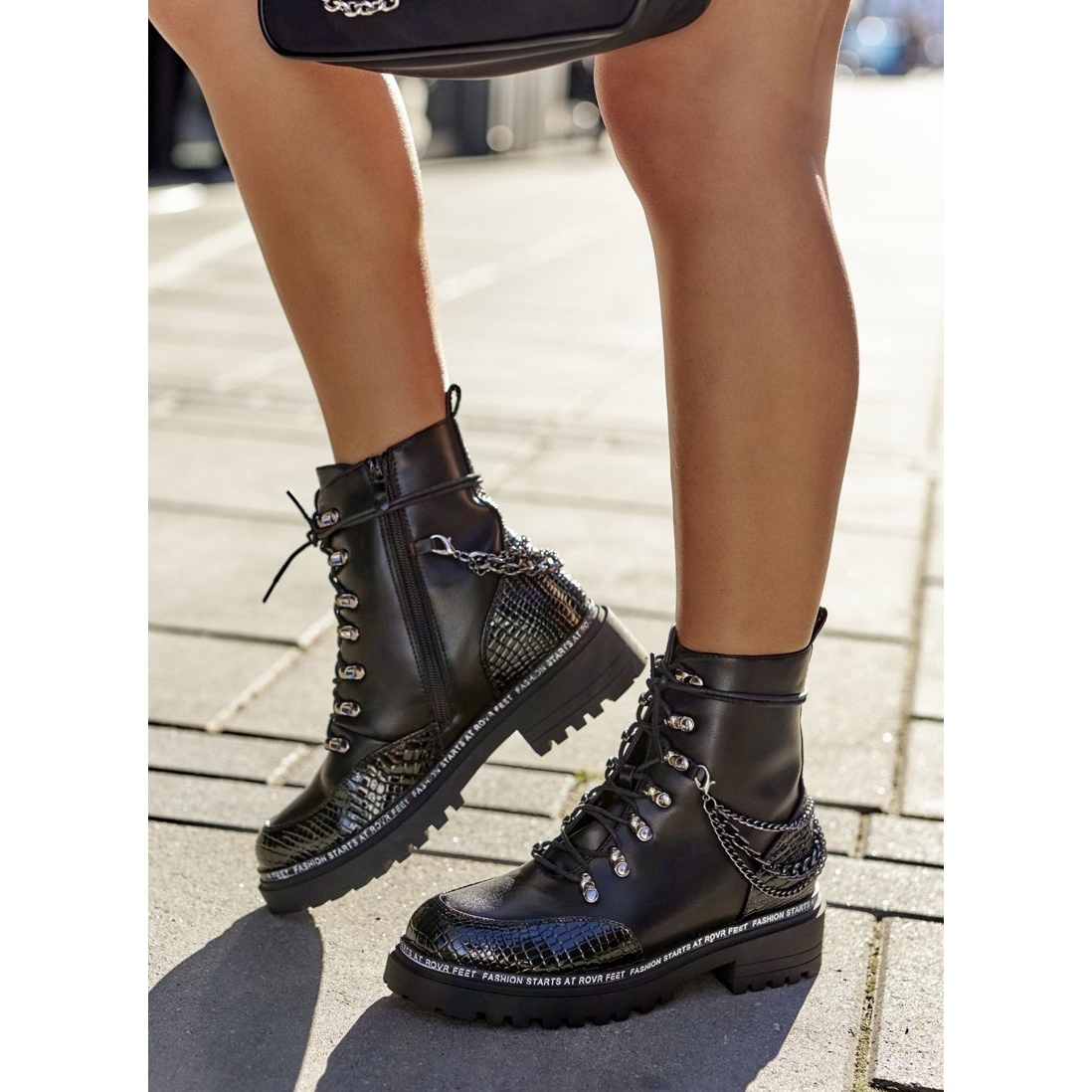 Stylish, practical women's workers made of ecological leather, which combine a raw, urban look with comfort. The interior insulated with a soft footwear blanket provides comfort and heat on cooler days. Decorated with metal chains for a fashionable accent, equipped simultaneously with lacing and a comfortable side lock - easy to put on and adjust in terms of fit.