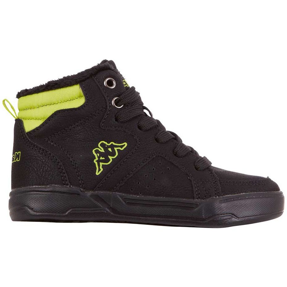 Children's shoes Kappa Grafton 260826t 1133 - black, insulated, high - perfect for cooler days. Made of durable synthetic materials, they combine a classic look with sports comfort. Thanks to the high upper and a soft, synthetic fur lining, they provide heat and comfort, and a practical side lock makes it easier to dress quickly. The foam insert and a rubber sole with the EVA insert cushion the steps and improve comfort during everyday games and urban wandering.