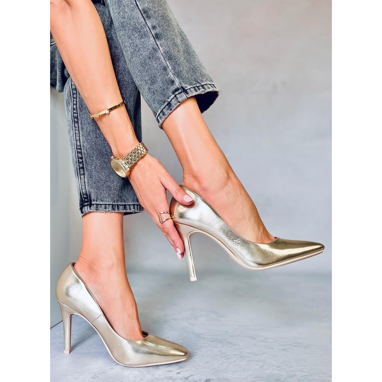 Made of high-quality eco-leather, the stilettos are characterized by a smooth surface and a delicate metallic shine that gives them a unique charm. The beige sole perfectly matches the elegant gold color, making them ideal for both everyday and more formal occasions.