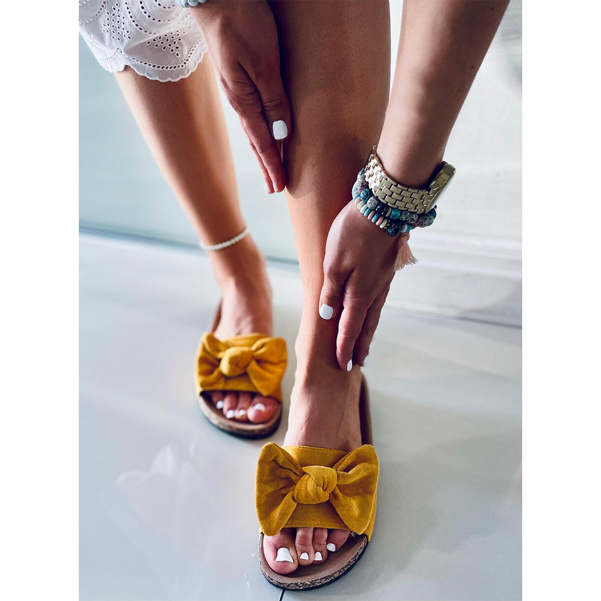 Discover summer comfort and style with the Kiara Yellow cork slides! These unique women's slides combine elegance and functionality, making them the perfect choice for everyday outings. The simple, smooth design in an intense yellow color, decorated with a subtle bow, will add freshness to any summer styling.