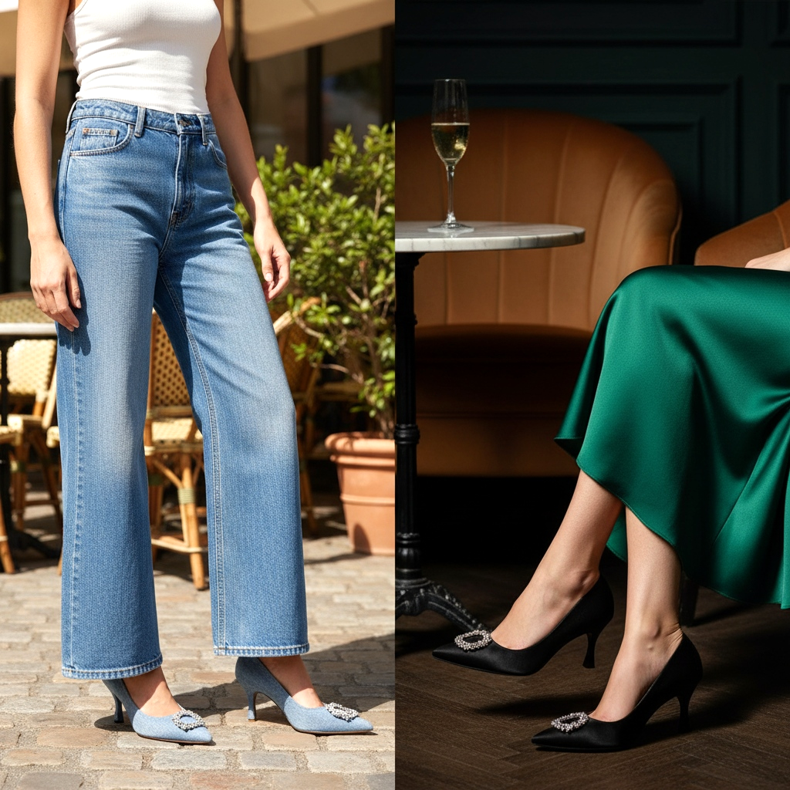 For an evening out with a vintage-style satin midi dress, kitten heels are perfect. The delicate heel height and classic cut match the more old-money and Parisian chic aesthetic that dominates in 2026.