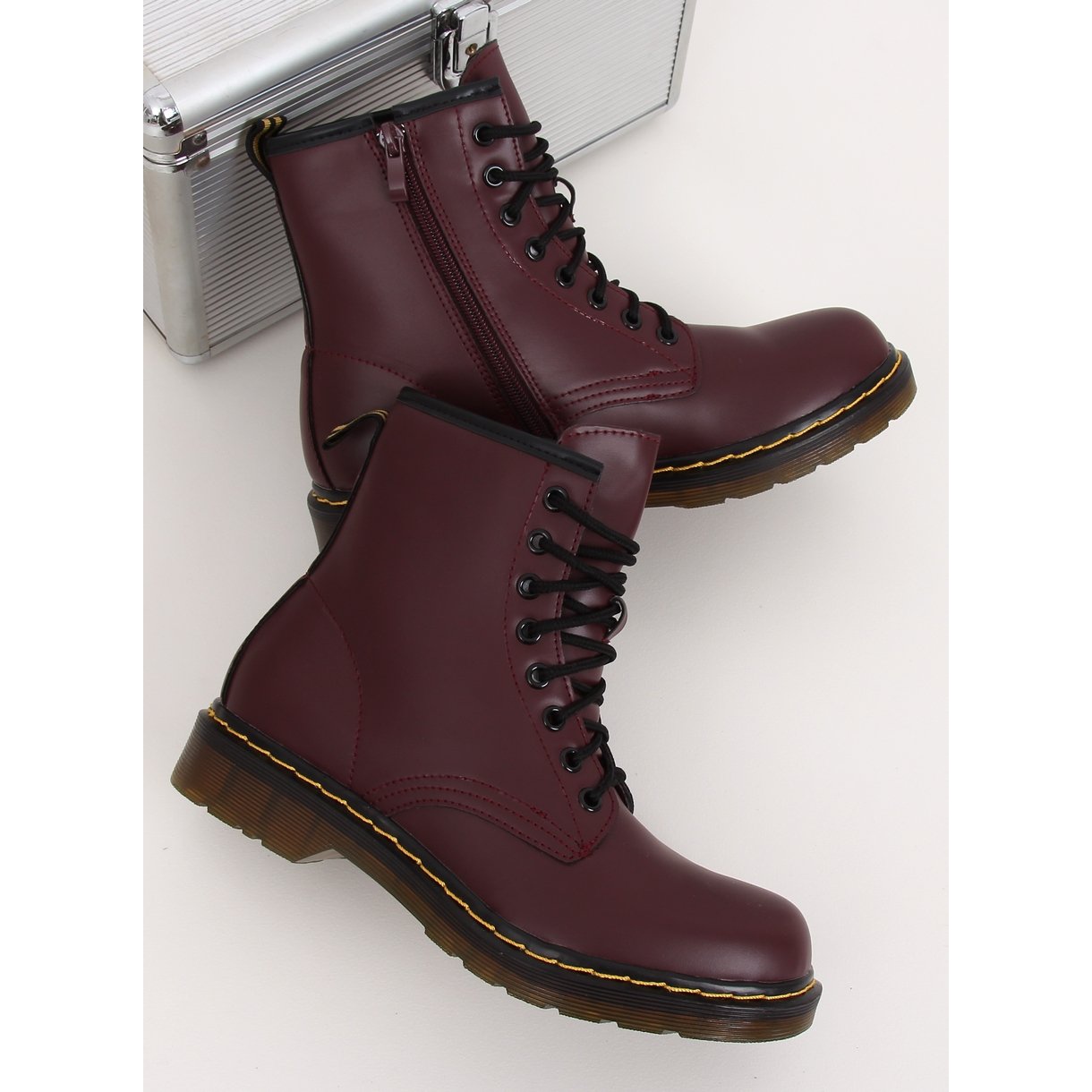 Discover extraordinary style and comfort with the lace-up ankle boots in burgundy NC1019 Wine Red. These women's work boots with a flat sole are a real must-have in every wardrobe. Their iconic style has been gaining popularity for many seasons, and the spectacular stitching along the sole perfectly harmonizes with the deep, burgundy color of the shoes.
