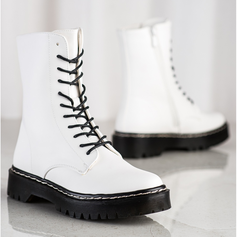 We present white lace-up combat boots on a platform from the manufacturer S. BARSKI - a perfect choice for women who value fashion, comfort and unique style. These unique shoes combine casual and rock elements, which makes them perfect for both everyday stylings and more daring outings.