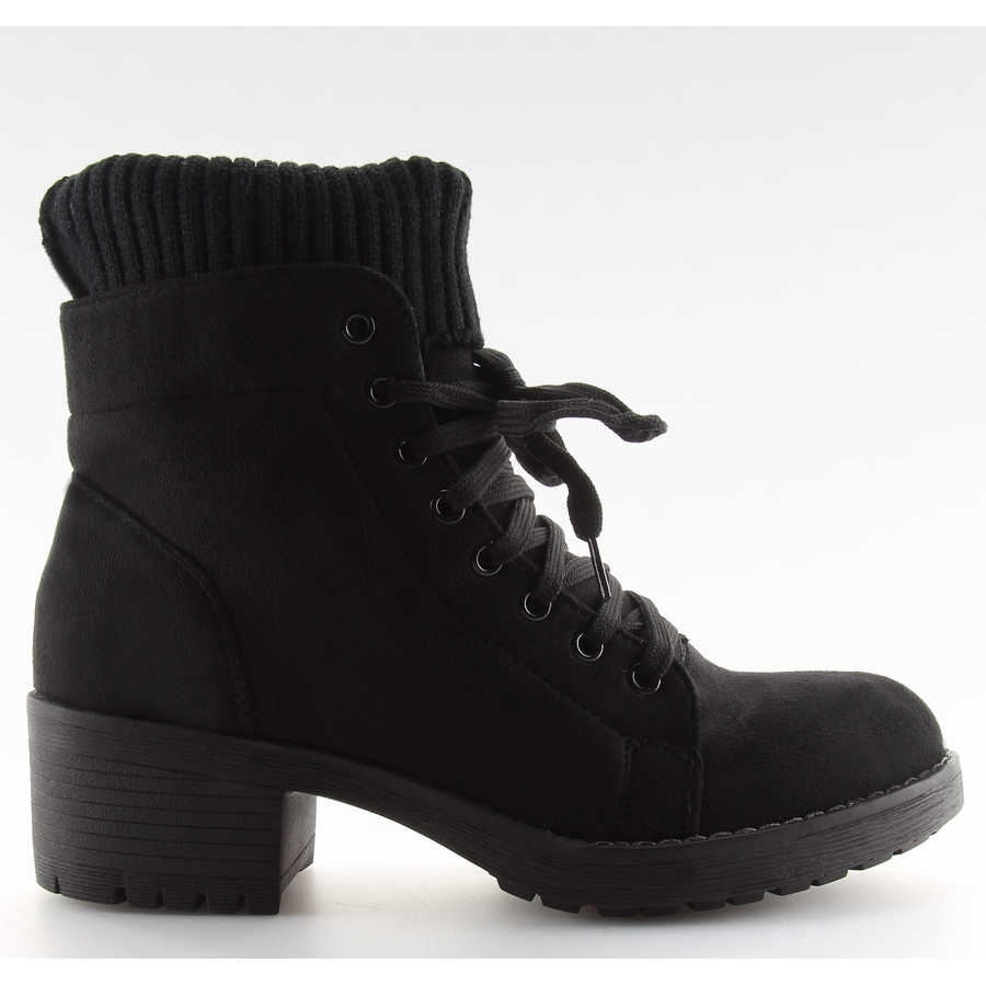 Classic black lace-up ankle boots with eco-suede trim. A soft, woolen collar resembling a sweater adds character. Insulated with fur, with a wide, stable 5 cm high heel and a solid sole with a protector - perfect for colder days.