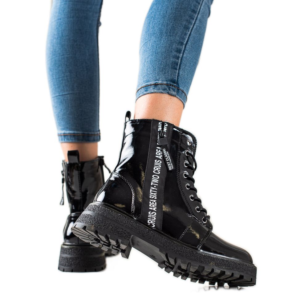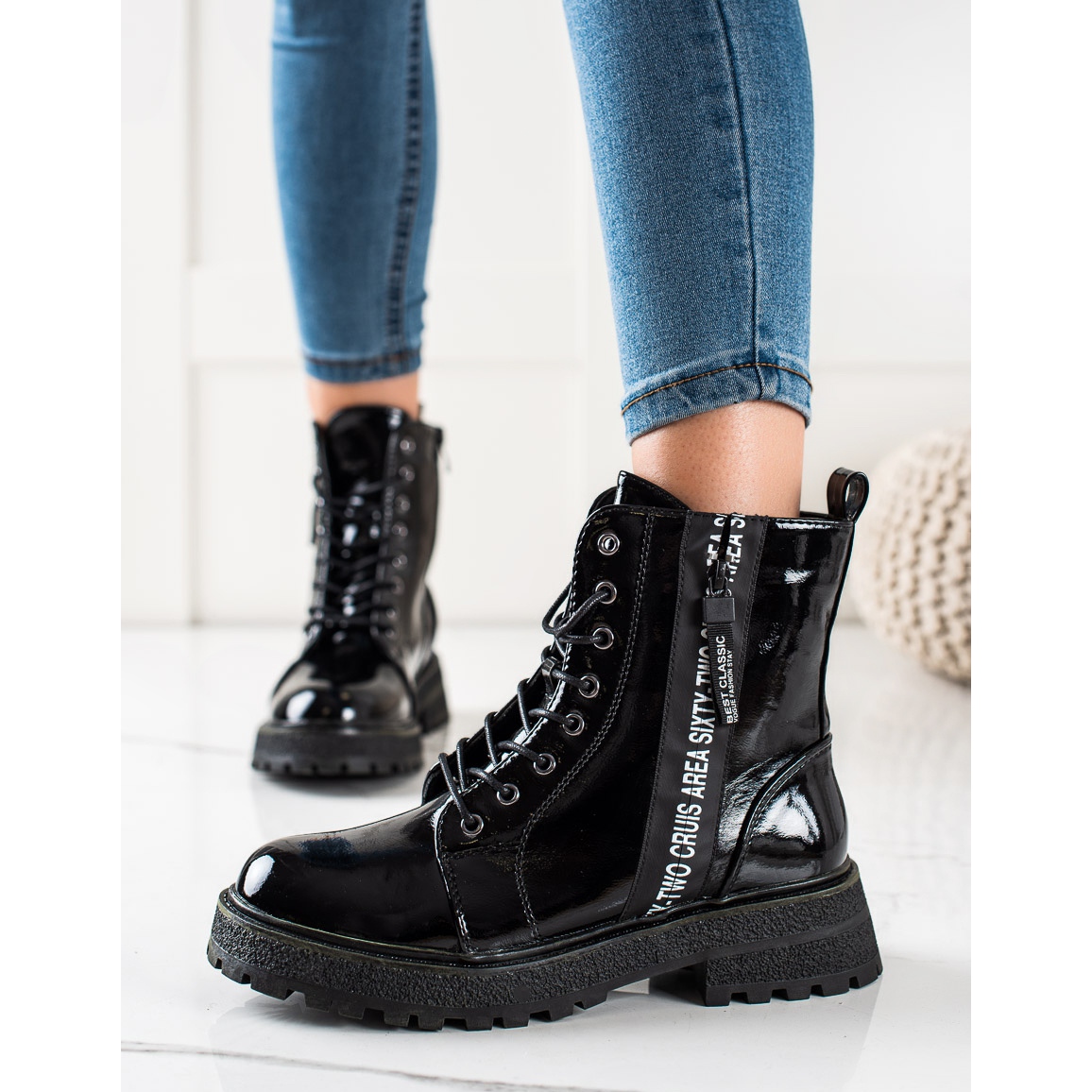 The black color and patent eco-leather give the shoes an elegant look, and the decorative zipper attracts attention, adding an extraordinary character. The zipper and laces ensure ease of putting on and a perfect fit to the foot.