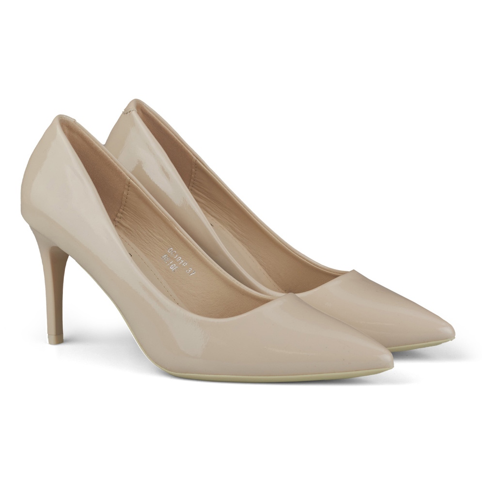 Elegant varnished beige women's pumps - a classic in a modern edition. Made of ecological varnished leather, with an elongated, pointed nose and a slim pin with a height of 8 cm. Perfect as a complement to both evening stylizations and more formal office sets.