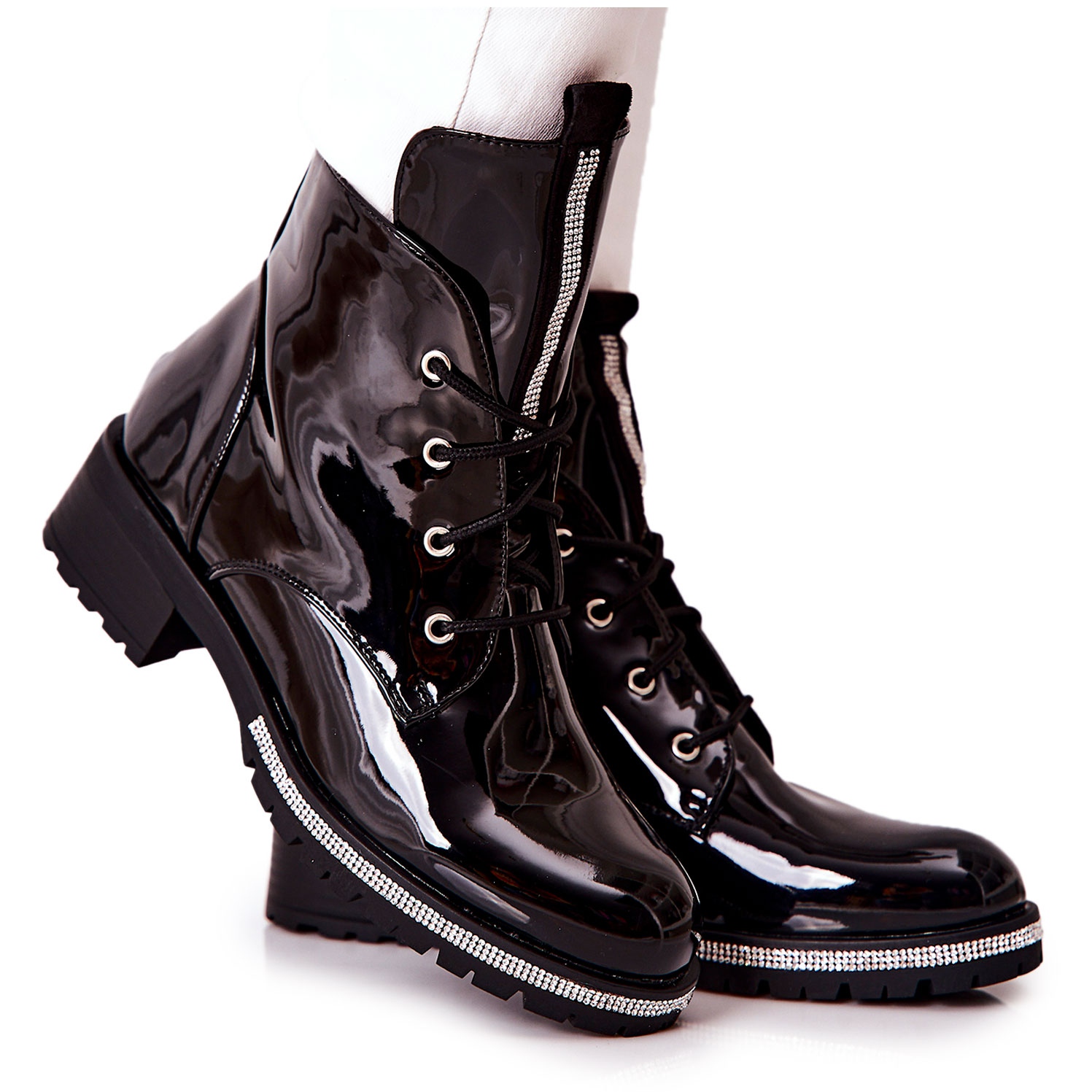We present elegant Grecia ankle boots that combine style with functionality. Made of patent eco-leather, these black ankle boots are a great choice for every fashionable woman who wants to stand out in the crowd. Their original design enriched with decorative rhinestones on the tongue and around the soles makes every step unique.