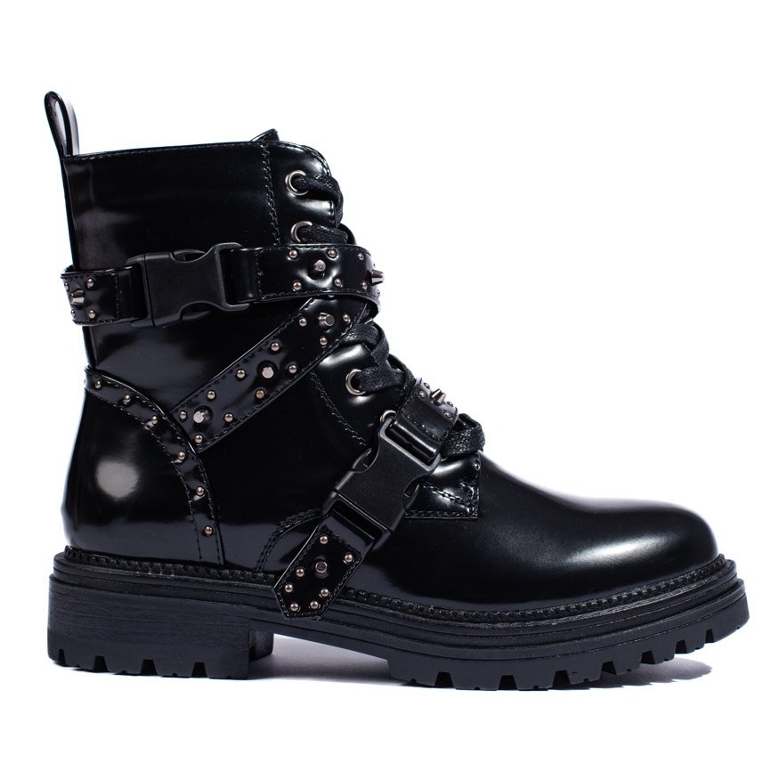 SHELOVET Women's patent black work boots are the perfect choice for women who value both style and comfort. Made of high-quality patent eco-leather, these boots feature an elegant, shiny finish and fashionable details such as rhinestones and studs.