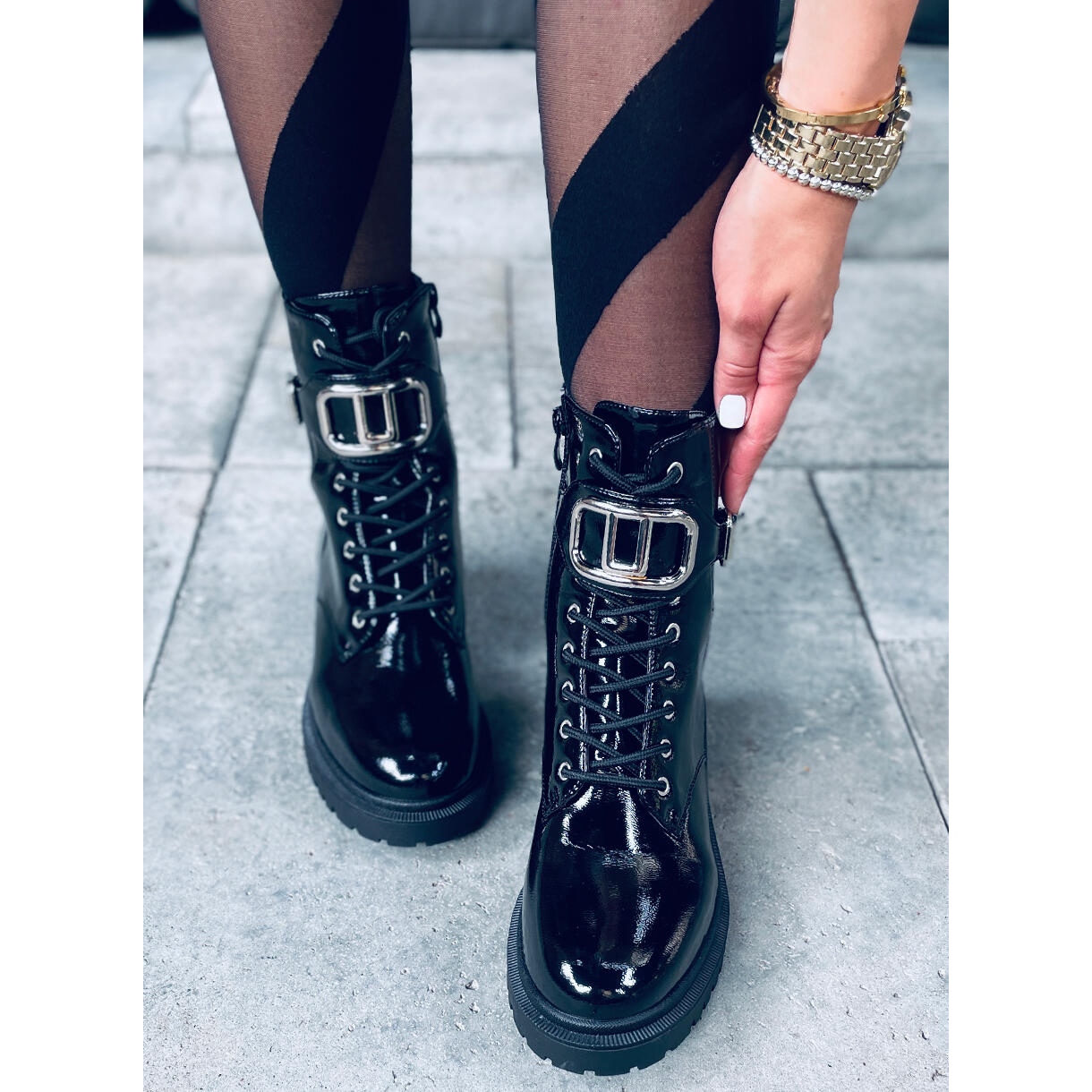Mila PATENT (BLACK) patent leather boots are a great choice for fashionable women who value style combined with comfort. These elegant workers on a high sole are distinguished by their classic design and the most fashionable patent finish, which gives them a unique character. An effective silver detail in the form of an ornament adds chic to the whole, guaranteeing a WOW effect every day!
