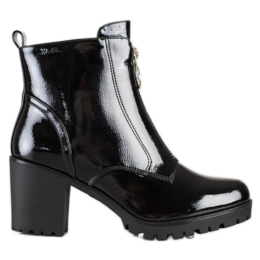 The closed, stiffened heel provides excellent support for the foot, and the round toe adds class and comfort. The boots have a stylish matte 7 cm high heel in the form of a block, which makes them ideal for both everyday use and evening outings or parties. The patent finish attracts attention, and the decorative zipper emphasizes the fashionable character of this model.