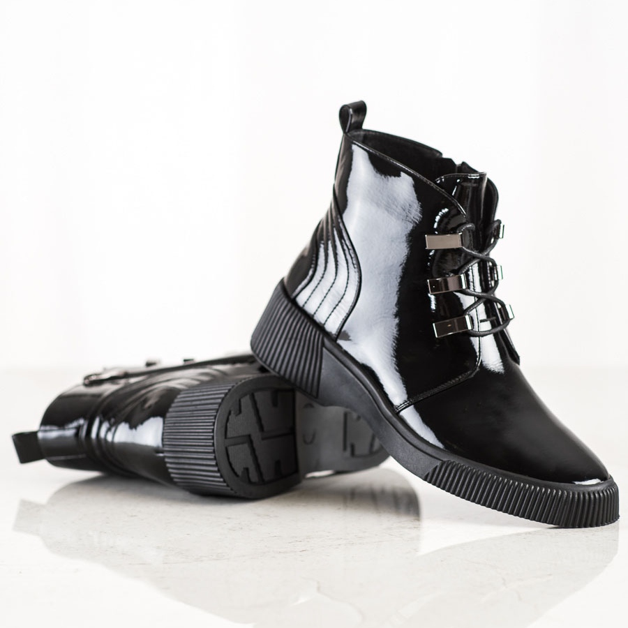 Made of high-quality ecological leather, the boots are characterized by a shiny finish that perfectly fits into fashion trends. The ankle-high model with a flat 4 cm heel provides stability and comfort during everyday use. Additionally, the comfort of wearing is increased by the insulated interior and textile insole.