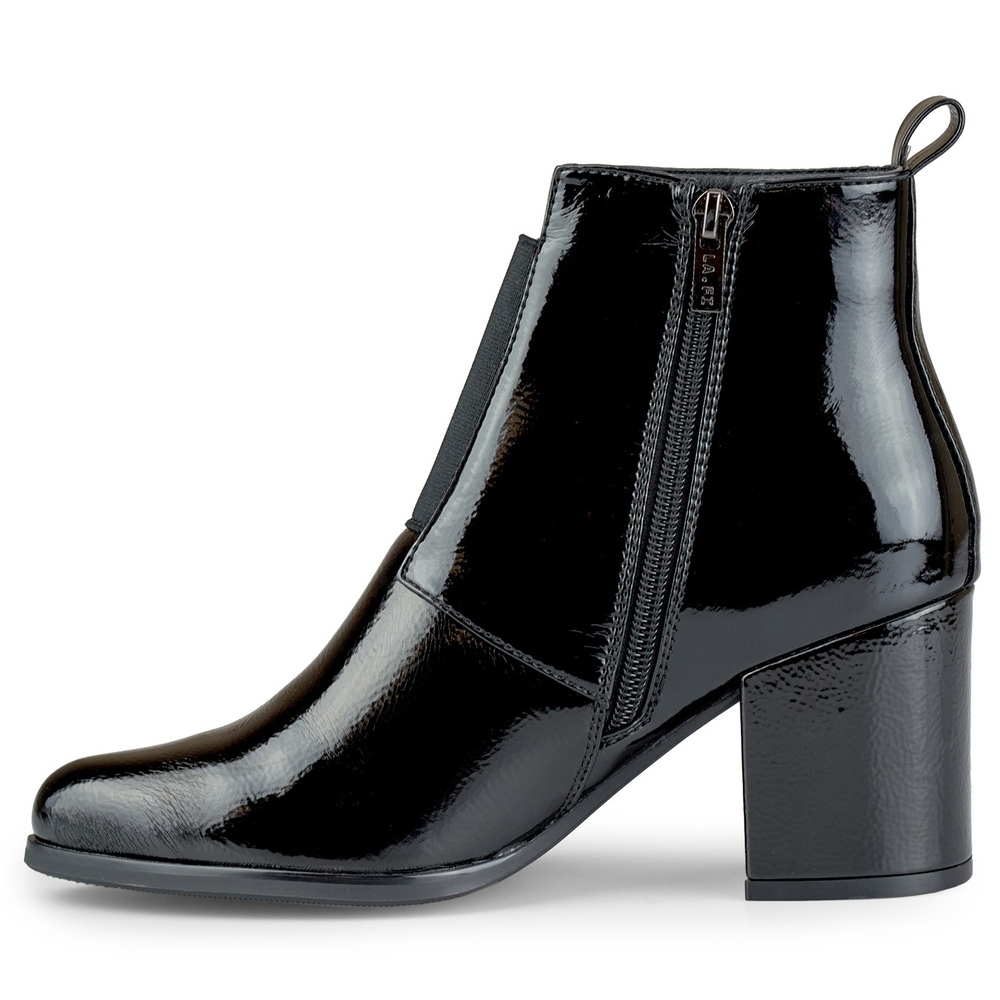 We offer you stylish and elegant black women's ankle boots with a patent finish, guaranteeing both comfort and a fashionable look in the fall and winter season. These flexible ankle boots are the quintessence of an everyday classic with a fashionable twist, which will be a perfect complement to any urban styling. The unique character of the footwear is emphasized by the shiny ecological suede upper, which contrasts beautifully with the autumn-winter weather.