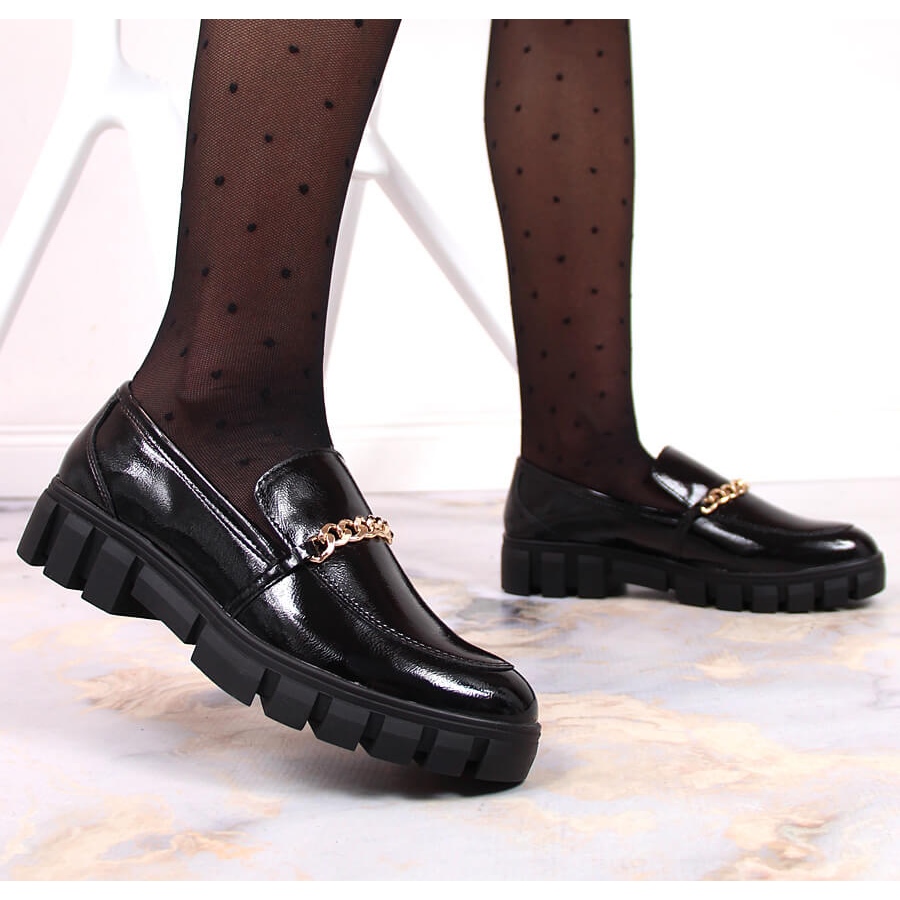 - Model: Lacquered loafers with a chain