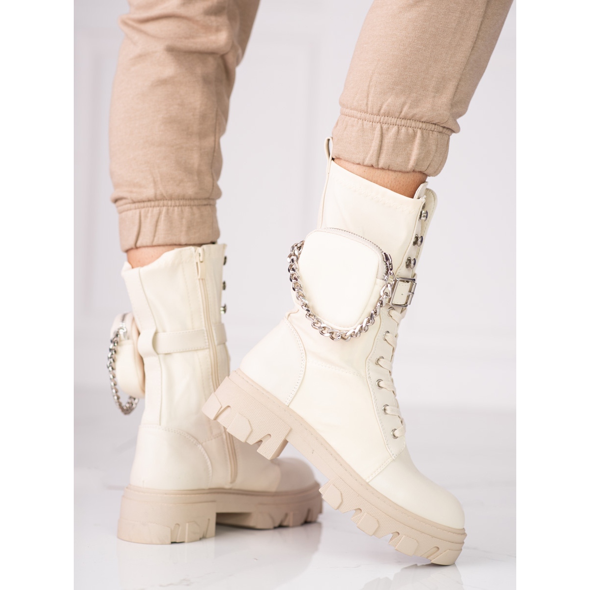 The beige color and minimalist design make these boots a perfect match for a variety of styles – from casual to more elegant. The zip, buckle and lace fastening allow for a perfect fit to the foot, and the additional element in the form of a chain gives them an original character.