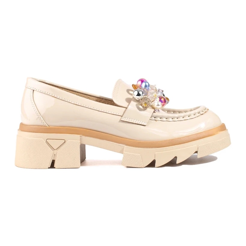 Elegant Shelovet shoes in the Beige shade is a combination of classics and a modern character. Painted, organic leather gives the shoes a subtle gloss, and decorative rhinestones add style, thanks to which the model will work for both everyday and more official stylizations. Thick, 5 cm platform ensures stability and optically slim the figure, while maintaining high wearing comfort.