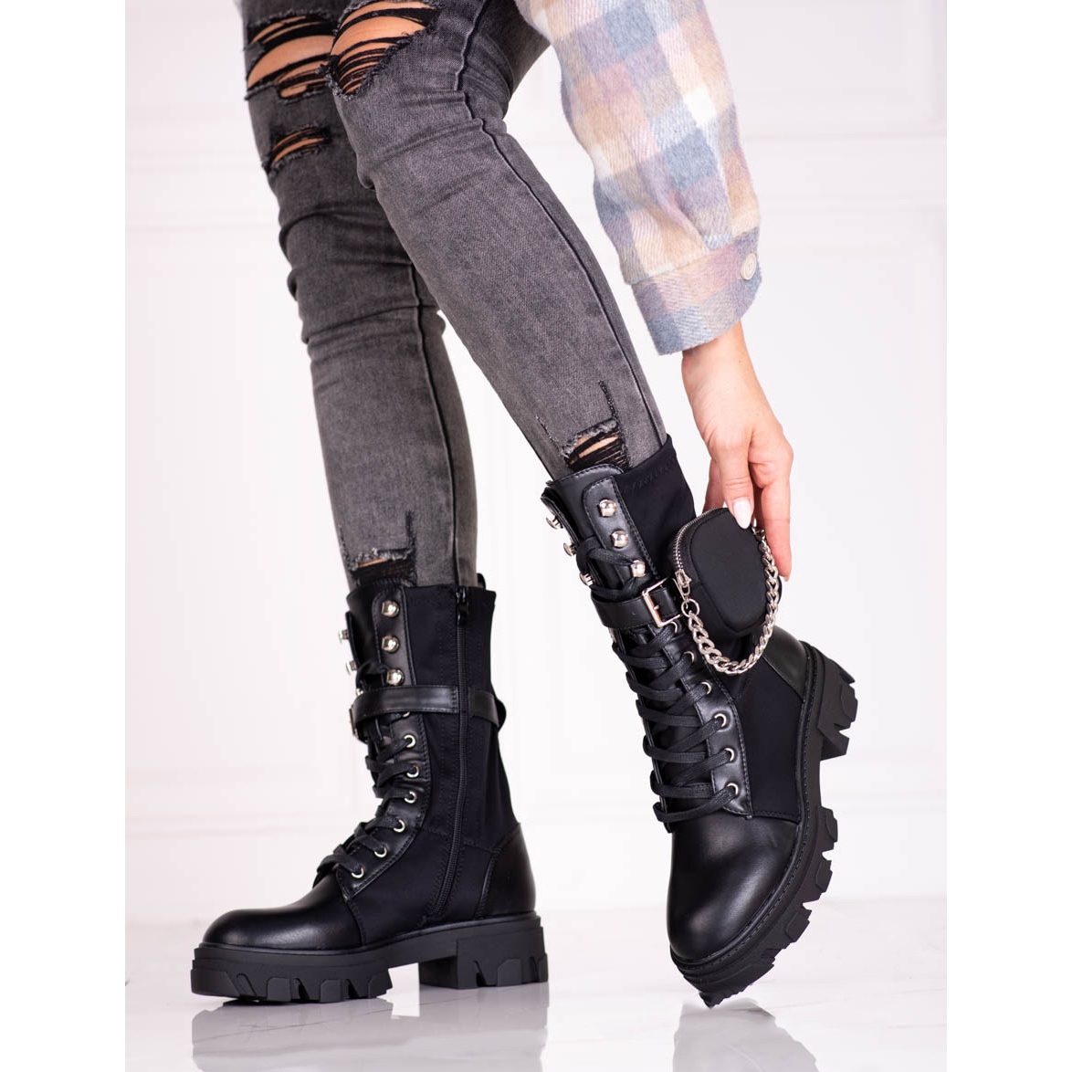 The distinguishing feature of this model is the flat heel with a height of 4.5 cm and a platform of 3 cm, which makes them extremely comfortable for everyday use. The treaded sole made of synthetic material provides good grip on various surfaces. Additionally, these workers are equipped with a functional bag that completes the whole styling.