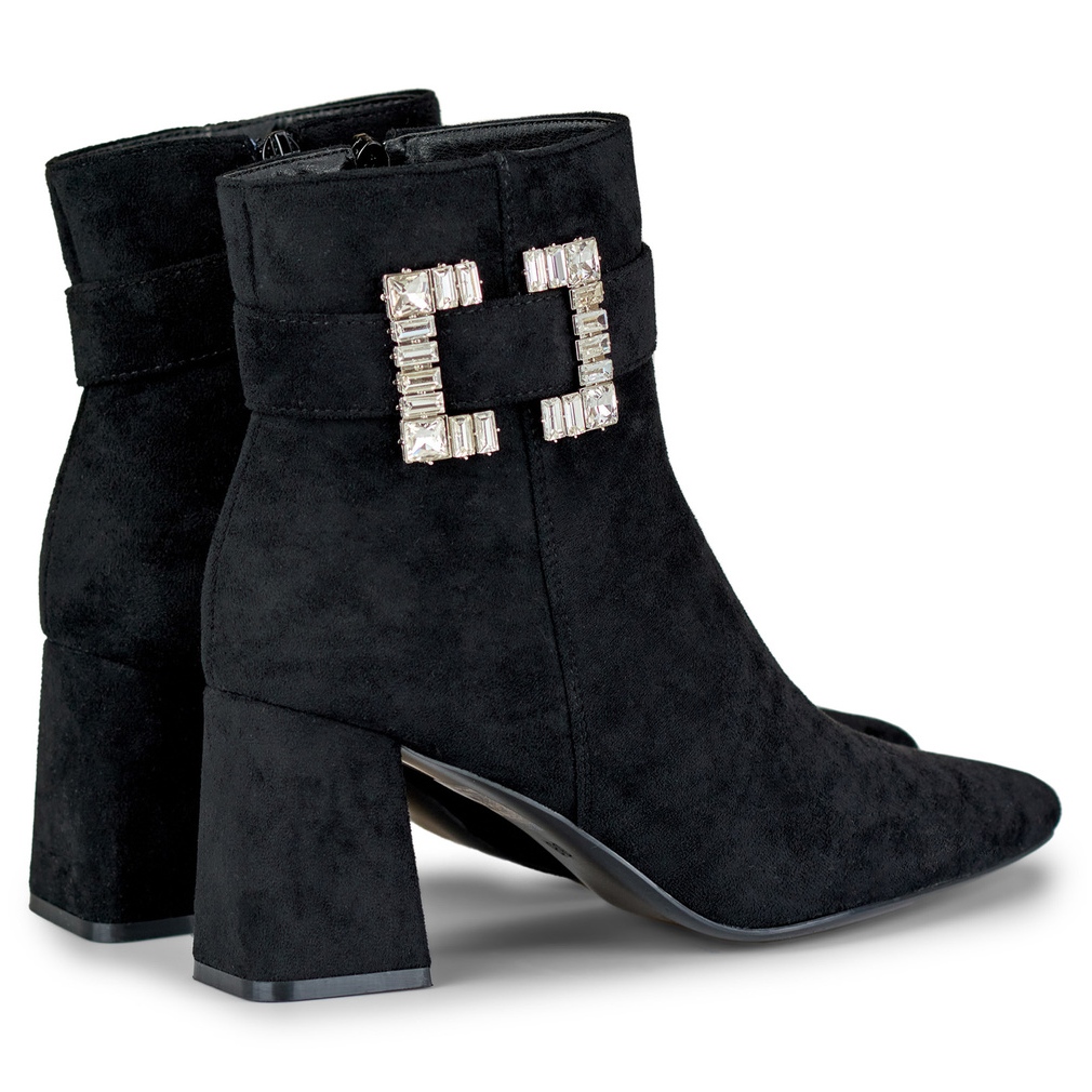 Classic, for ankle, an ecological suede boot is a must-have in an autumn and winter wardrobe. Gently pointed nose and a stable heel such as a post (7.5 cm) slim the figure, and the decorative buckle and subtle jets add the character of any stylization. The side castle makes it easier to insert, and the textile insole ensures comfort all day.