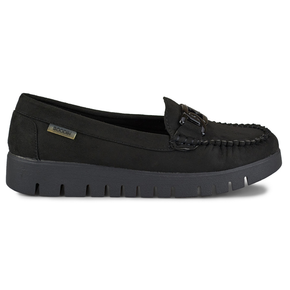 Elegant, slip -up loafers from the Keeshoes collection - made of soft ecological suede, with a natural leather insert and a light, synthetic sole for 3 cm platform. Universal, black colors and round nose make the shoes match both the office and the weekend outputs.