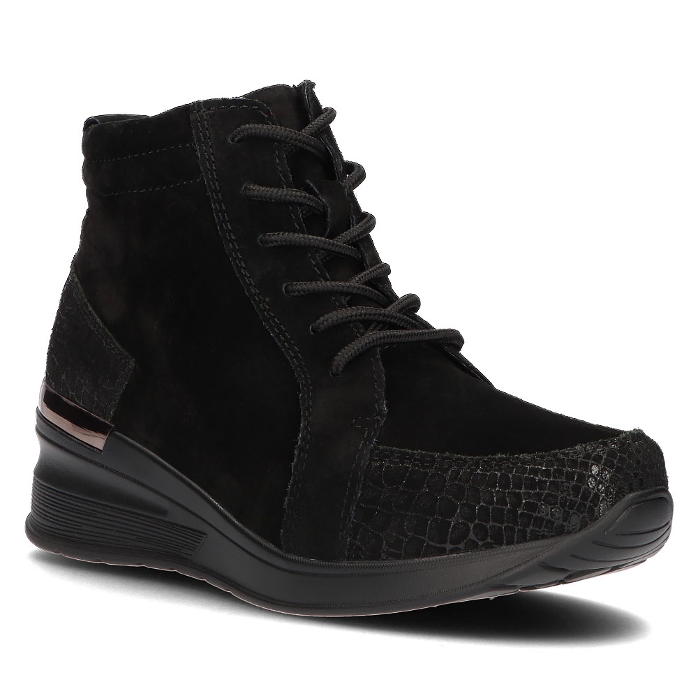 Thanks to the zip fastening system and lacing, you can easily adjust them to your foot, which increases the comfort of use. The sole made of plastic guarantees good grip, and the platform height of 1.5 cm and the wedge height of 5 cm add subtle elegance.