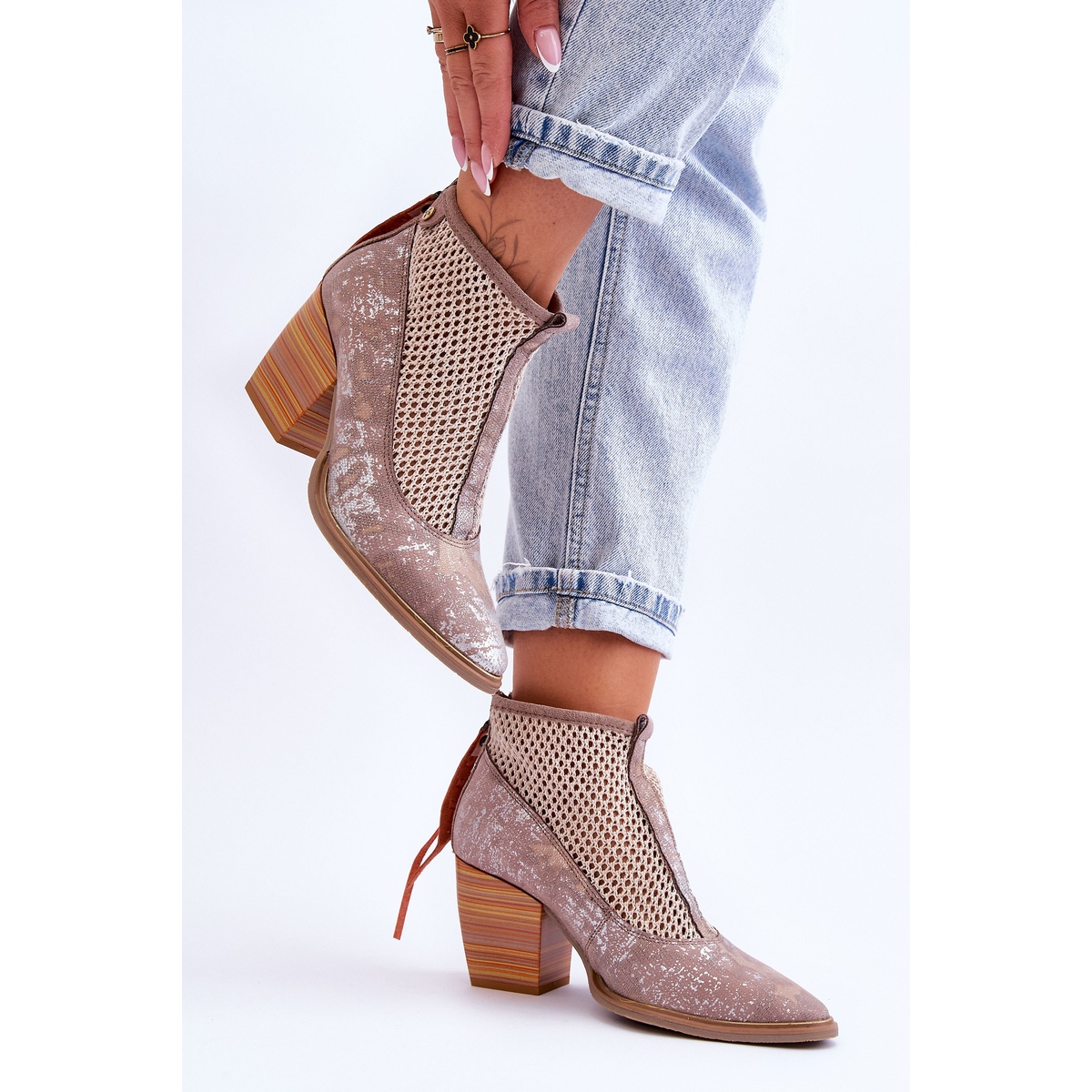 Made of high-quality natural leather, the boots stand out not only for their elegant aesthetics, but also for their functionality. The decorative mesh adds a light, openwork character, which makes them a great choice for spring, summer and autumn. The classic zip fastening at the back of the upper makes it easy to put on, and the stiffened heel counter provides adequate support for the foot.