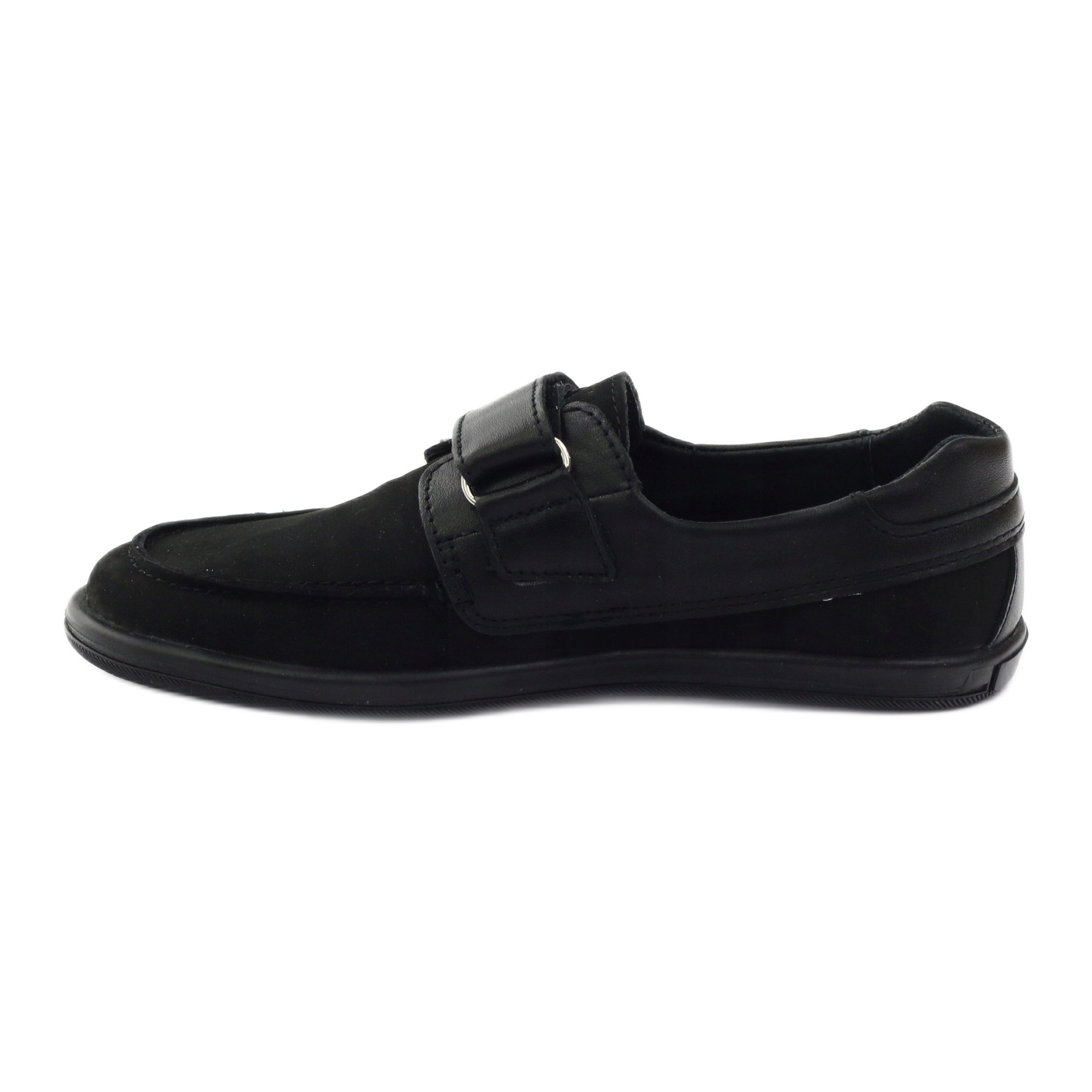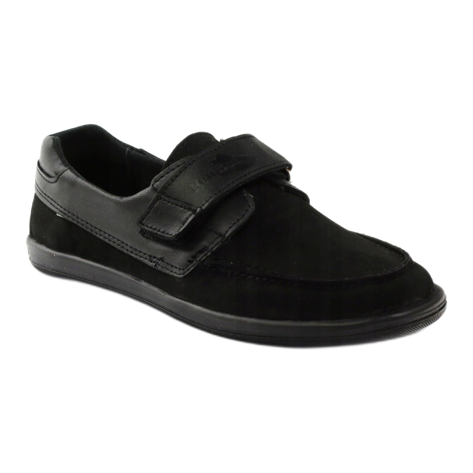Classic moccasins for boys made of soft nubuck natural leather in a universal black color. Model 4249 combines comfort and durability - fastened with Velcro for quick adjustment, with a stiff heel to stabilize the foot. The entire inside of the shoe is lined with natural leather, and the antibacterial, profiled leather insole increases wearing comfort. The thermo-rubber sole guarantees good grip on various surfaces - perfect for colder days.