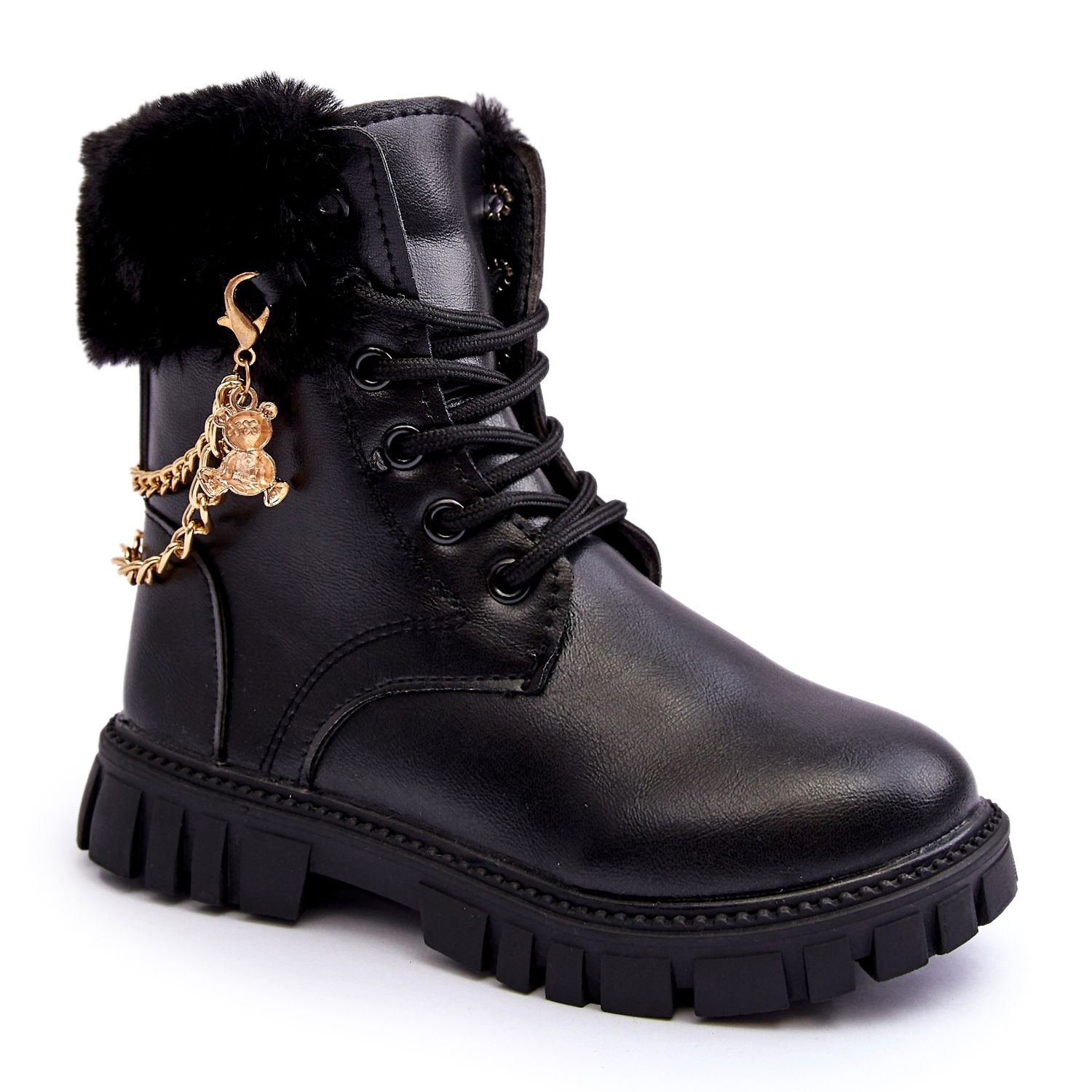 Leather insulated children's boots with a chain - black