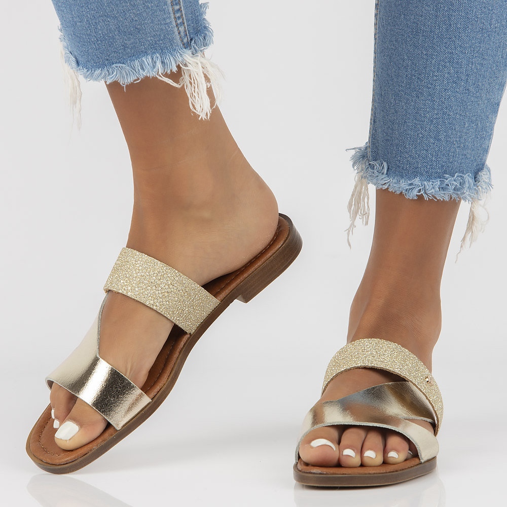 The 40260 model features a 1.5 cm flat heel and a low 0.5 cm platform, which ensures stability and comfort when worn. The round toe shape adds subtlety, and the gold color makes them an ideal choice for both everyday outings and more elegant occasions.