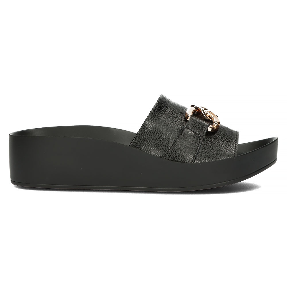 The flip-flops have a round toe and are without a toe, which makes them ideal for warm days. Their 4.5 cm high synthetic sole and 2 cm high platform guarantee stability and comfort when walking. An additional advantage is the elegant chain decorating the flip-flops, which gives them a unique character.