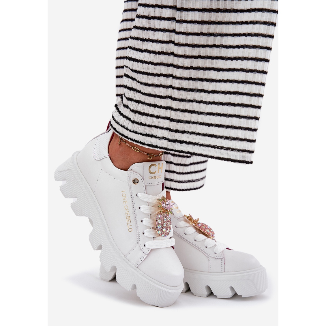 The original accent that distinguishes this model is a pineapple -shaped brooch decorated with zircons, adding character and a bit of glow. Thanks to the universal, white color, these shoes blend well with various outfits, from a sports look to casual elegance.