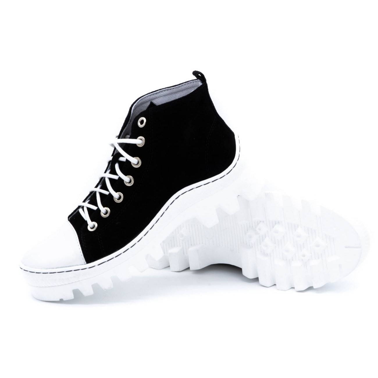 Made of high quality natural suede leather in a shade of black "black (black pearl)", with a contrasting white sole. The interior and insert also from natural leather, which ensures comfort and good breathability of the foot. A stable platform with a height of 4 cm and a high upper reaching in front of the ankle (9 cm) guarantee comfort during longer walks and add a subtle height. The boots have a round nose and classic lacing, thanks to which you can easily match them to your foot. No insulation - perfect for temporary and cooler days without frost.
