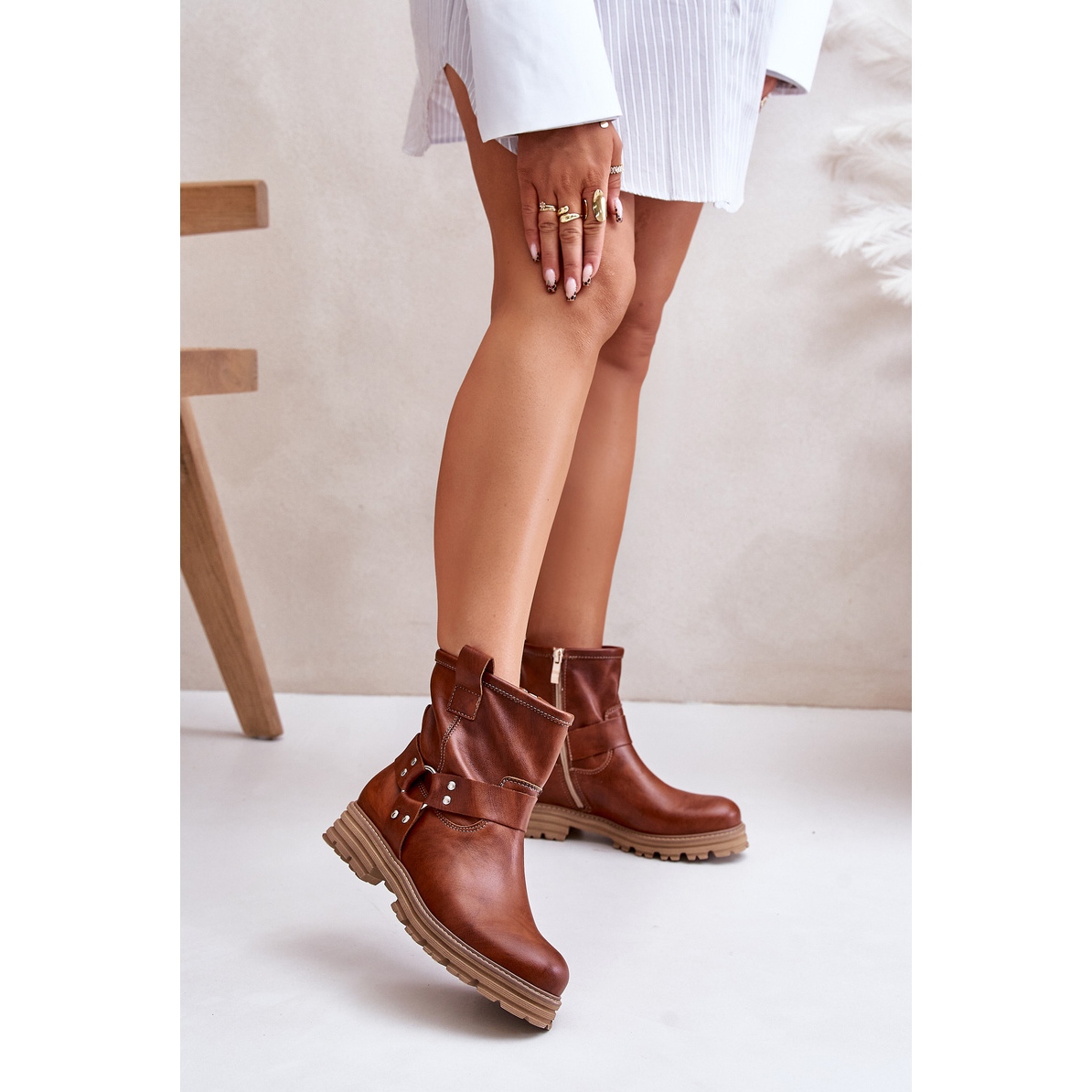 Their minimalist design with rounded toes gives subtlety, and a comfortable, flat heel with a height of 4 cm ensures stability and comfort of wearing all day. The boots have a practical zip fastener, which makes it easier to put on and take off. In addition, the upper is decorated with a spectacular combination of straps with rhinestones, which emphasizes their unique character and makes them an ideal complement to fashionable stylizations.