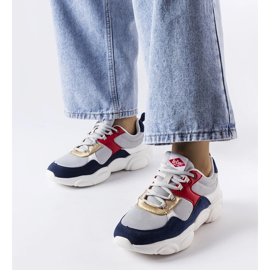 Gray sports sneakers Lee Cooper - light, comfortable and stylish footwear for active women. Perfect for spring and summer, they combine the comfort of a fabric upper with a fashionable appearance decorated with navy blue and golden accents.