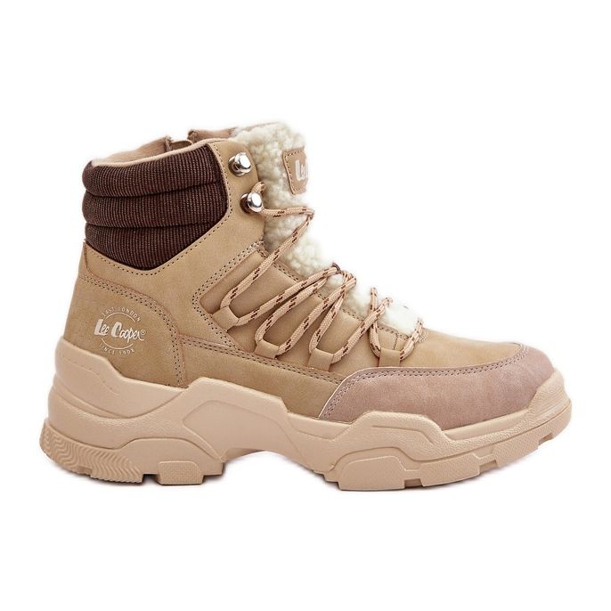 The heel height is 3 cm, which allows free movement, and the upper reaching the ankles (12 cm) provides additional support and stability. The Lee Cooper hiking boots have a round toe and are available in a delicate beige color that is easy to combine with various stylizations.