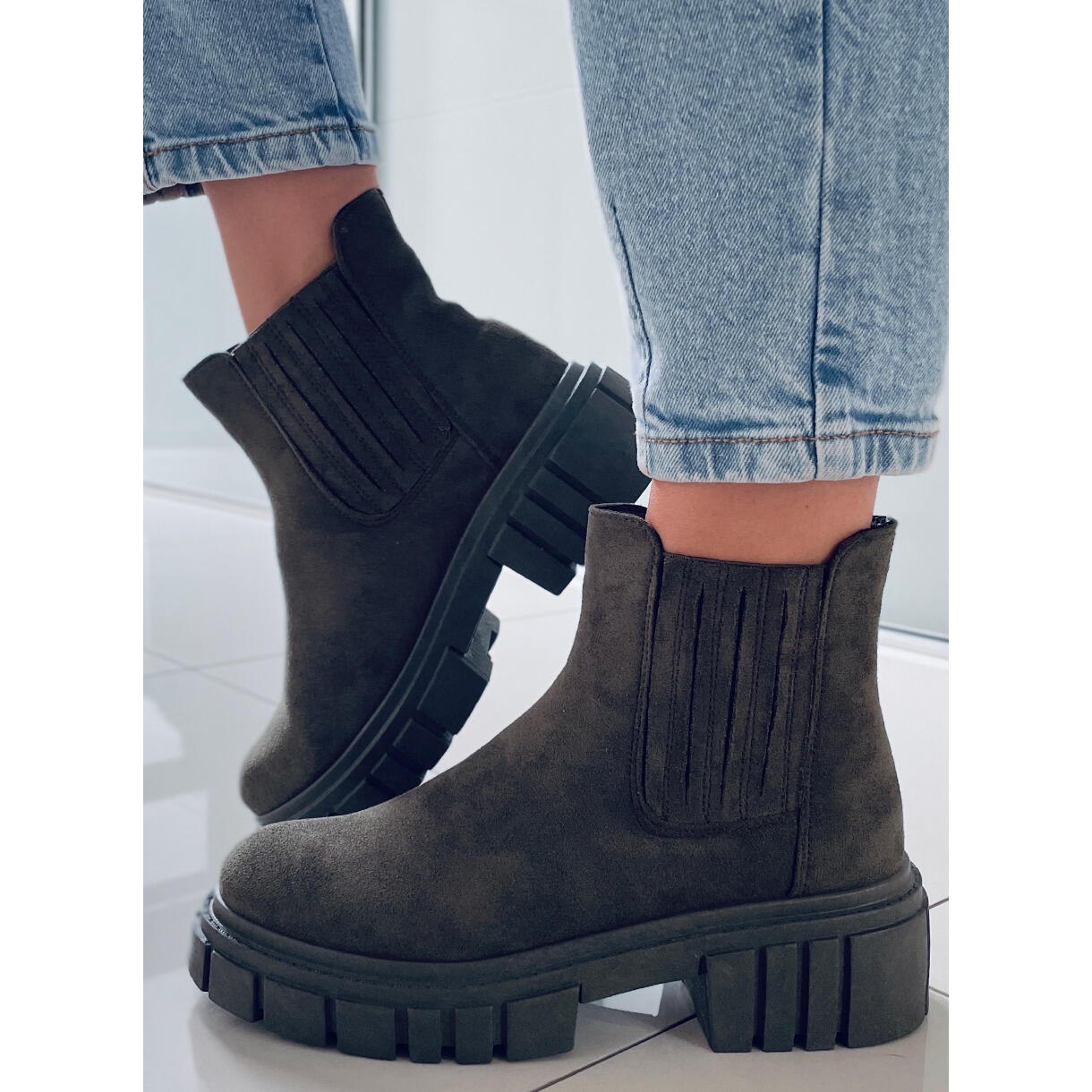 Introducing the Leigh Green women's Chelsea boots in a trendy khaki green shade, which are the perfect complement to any everyday style. These suede ankle boots with a thick sole combine elegance with comfort, making them a great choice for various occasions.